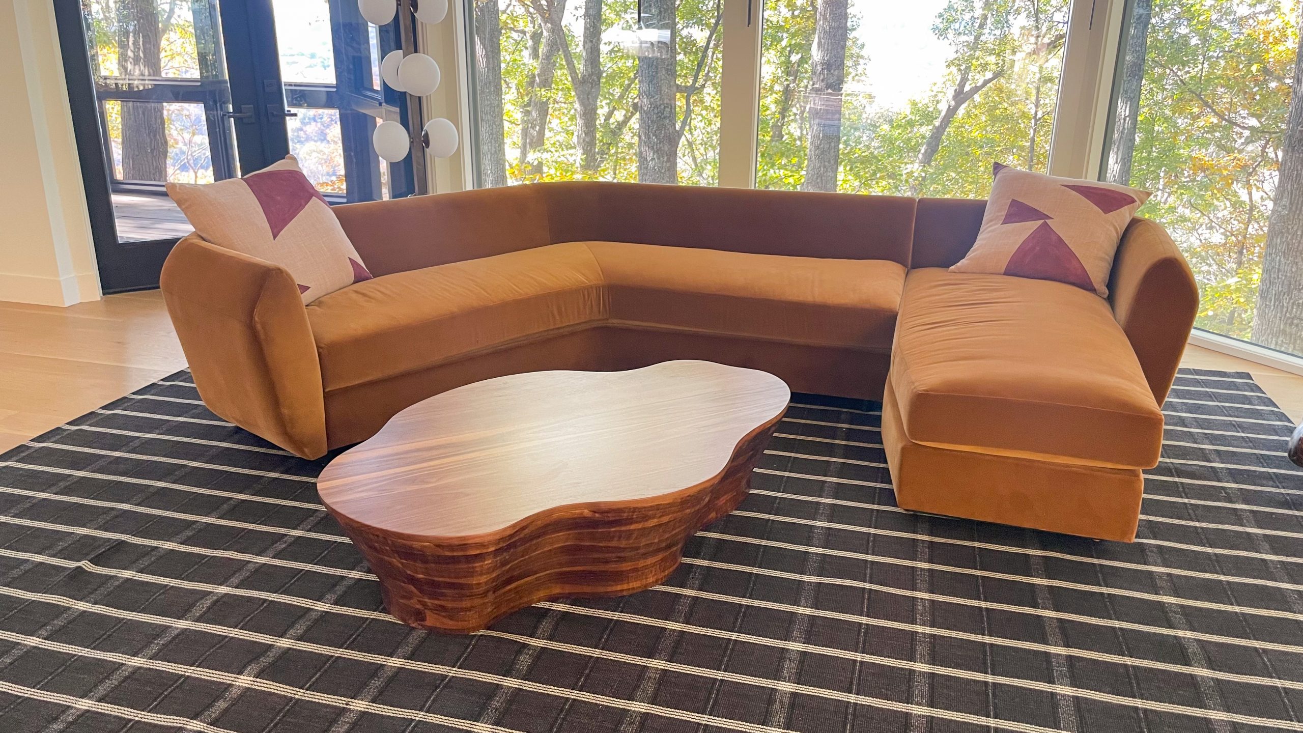 Organic shaped walnut coffee table for this beautiful Nashville mountain home